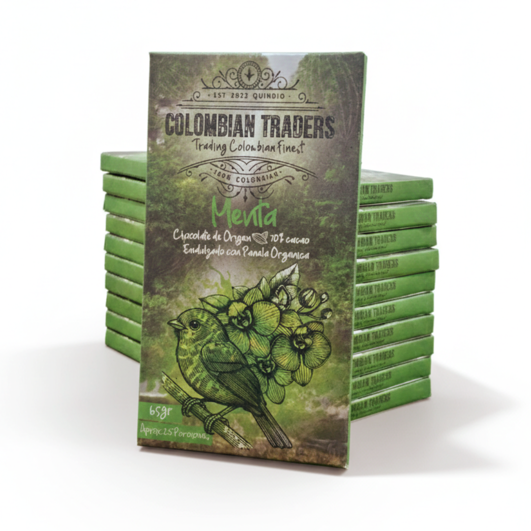 Chocolatina con chocolate de Origen 70% Cacao, endulzado con panela orgánica. Frescura herbal y profundidad cacaotera en perfecta armonía. Esta chocolatina artesanal ofrece un equilibrio entre el sabor intenso del cacao colombiano y la ligereza refrescante de la menta natural. Una delicia revitalizante.